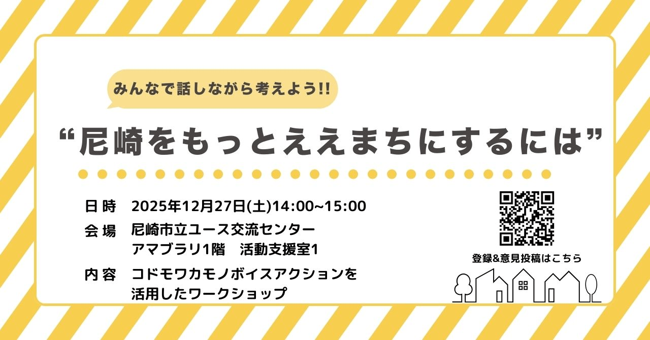 尼崎をもっとええまちにするには?Vol.2 尼崎市をもっと若者の声を市政に反映していくことを目的に様々な意見を募集しています。 今回は、第一回目の取り組みとして、「あまがさきをもっとええまちにするには?」をテーマに意見募集とワークショップを開催します。 ぜひ意見への投稿やワークショップにご参加ください。 事