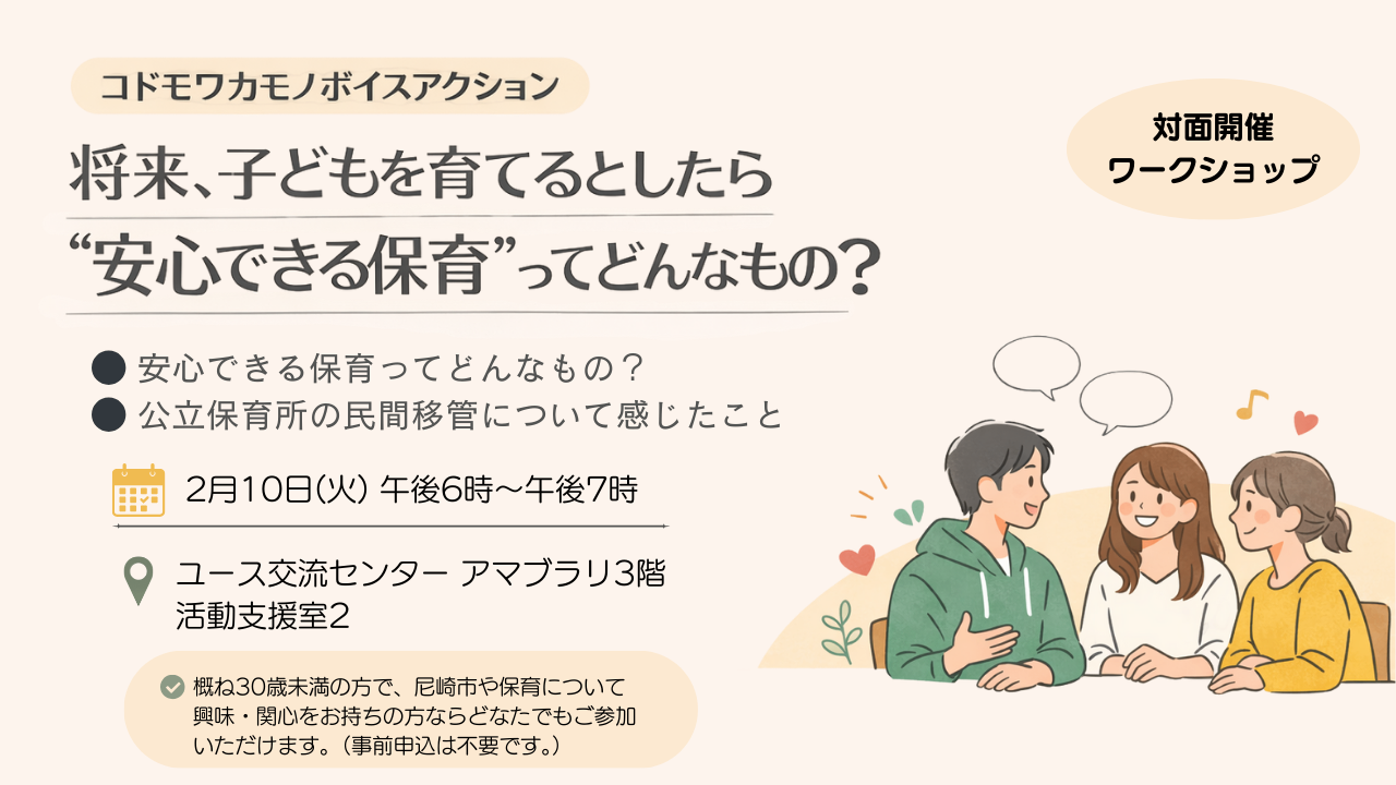 尼崎市では、こども・若者たちや日常的にこども・若者たちに関わっている大人たちが、普段どんなことを考え、どんなことを課題だと思っているのかを知り、少しでも過ごしやすい環境になるために、たくさんの声を集め、少しでも反映できるようにコドモワカモノボイスアクションをスタートしました。